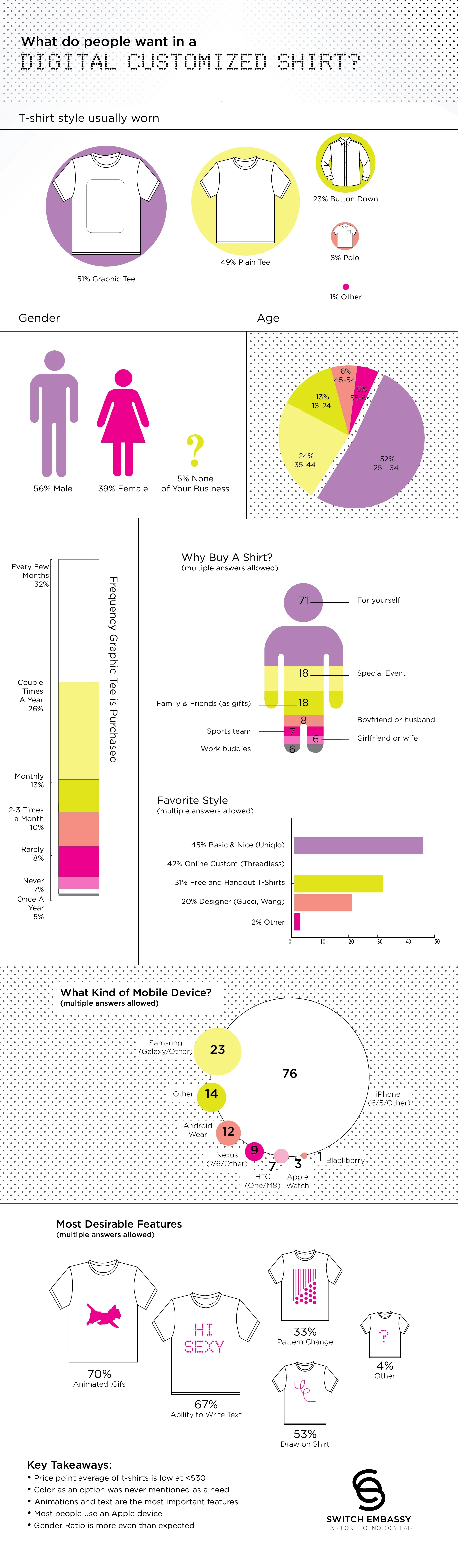 Post-delivery of the tshirtOS analysis was done to understand if tshirtOS is a viable product for the business. As part of building the business model canvas, 120 interested potential customers did a survey to understand what would make a possible MVP to kick off. The conclusion was the product is too expensive for mass production investment and the price points only work with promotional campaigns or specialty events.