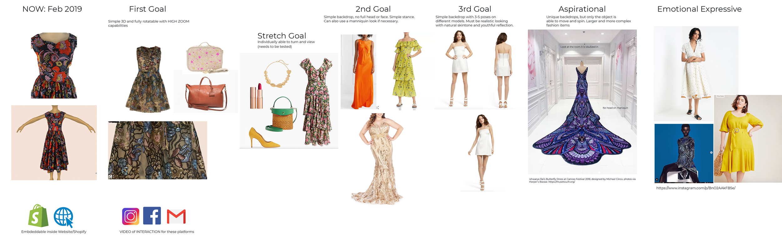 After initially meeting with the team, the first work was to create a visual common language of the technology now and a roadmap for the future. The imagery left shows a priority on the mannequin since the product has the capability to be worn or dressed on an avatar. However, the styling of the avatar was a distraction and it lacked focus on the undeniable power of the technology to capture the texture and fabric with exquisite realistic detail. The first visual/technical goal to remove the mannequin from the viewer and have an emphasis on the textile or garment itself. A stretch goal is to have all the products together as part of a showcase. After that, people re-appear but in a more stylish and personal format for showrooms and fit. The ultimate goal, which the OHZONE team achieved by 2020 is a move forward into having the product dressed on digital avatars for runway shows or specialty showcases, and finally for it to be in realistic spaces and AR/VR technology.
